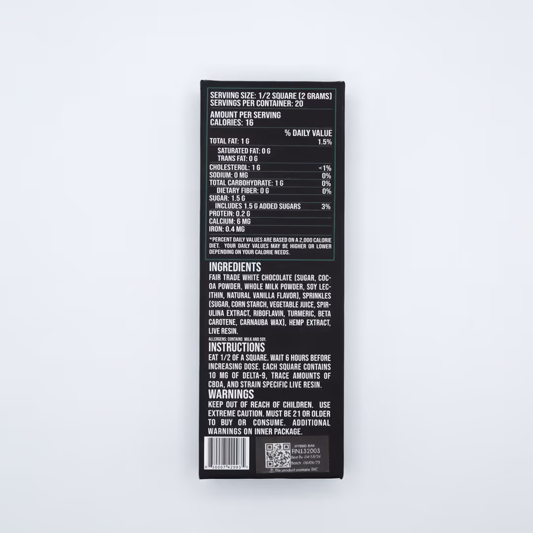 The white chocolate base is rich and sweet with cake batter notes and a celebratory flavor profile that makes it a standout among traditional edibles. Scored into 10 even pieces for 10mg servings, it offers simple, consistent dosing for new and experienced users alike.